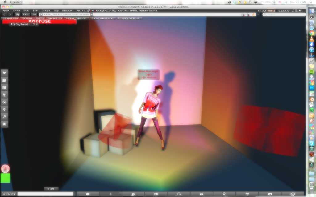 You can also get different lighting effects by changing the windlight. The other pictures were shot in completely black settings with all lighting coming from the projectors. This one is shot in a daytime windlight (from Gogo) for a completely different feeling. You can see the difference in the two raw shots on my profile – uploaded directly from in-world with dark lighting and bright lighting. Since the only way to upload there is direct from Second Life, only raw photos get uploaded to the profile.