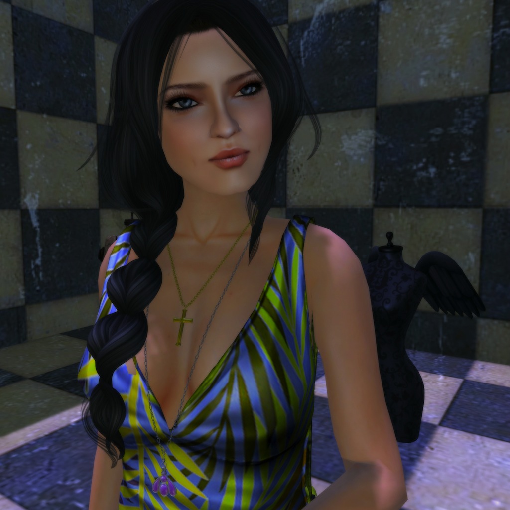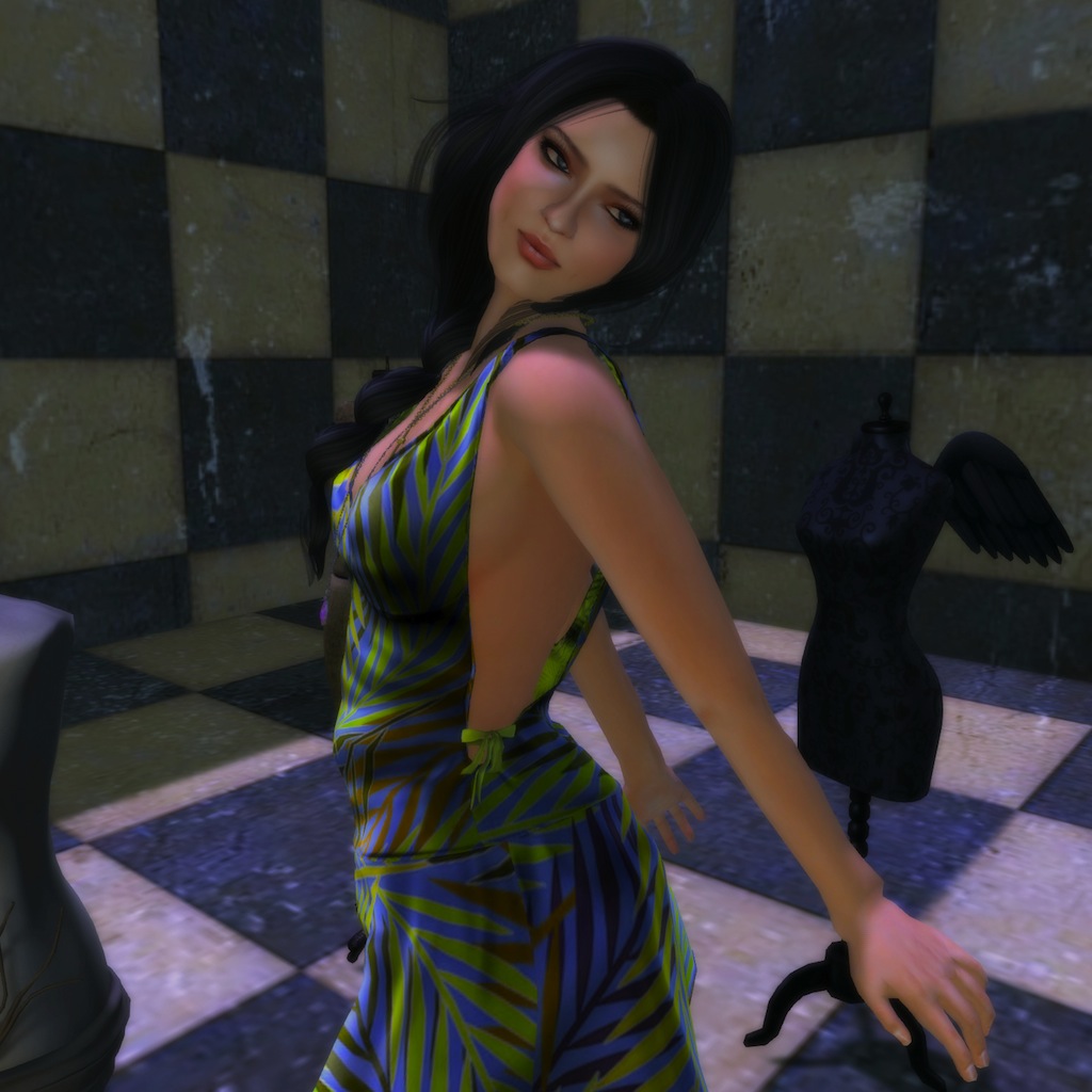 Not a practical item, so much whimsy to be had, and you don’t have to be royalty to own them! I was inspired to pose with my dress forms, and I shall use them to decorate my SL bedroom! In these photos are a couple of other things I must note. First off, the skin I’m wearing is from Adam &Eve, the Carolyn skin. Honestly, I’d have to pose buck naked to really give you the full effect; this skin has one of the most beautiful bodies I’ve ever seen on a skin. The fact that I can add dimples to the face tickles me pink. Secondly, I went thru hell to obtain the Wasabi Pills hair in the RARE ash color. Well if hell can be described as scouring yard sales to find the color and paying $300L to get it! I also tried my luck at the Arcade Gacha, but only managed to get every rare but the one I wanted! Wasabi Pills is my favorite hair at the moment, because there’s a feeling of yes, whimsy, in all her designs I find particularly appealing. Third, the dress is the Valentina.E. Angie dress that I picked up at Fameshed. I love a mesh dress that fits well and moves so elegantly with my av. And lastly, my jewelry is Maxi Gossamer, a jewelry maker I really admire a lot. See below for what I’m wearing.
