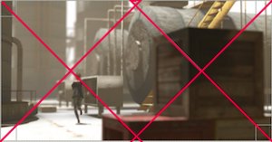 picture. By shooting from an angle, the edges of the box, the walkway along the machines, the line on the floor all create a diagonal line for our eyes to follow. The title is The Only Way Out and its importance is emphasized by its placement. See how the diagonals intersect on the exit.