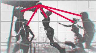 so it’s using poses and animations to suggest action. This is enhanced by using Depth of Field, bringing the ball which is contention into sharper focus and letting the rest blur. The rule of fifths is used to place the ‘horizon’, what seems to be the top of the wall of a circus tent in the background. Three players were also placed on fifths and one is dead center. The core element of the composition, though, is their gaze. All of them are looking at the ballad two of them, their arms are extending to the ball. It’s a great shot, desaturated, though with a hint of blue to suggest the light .