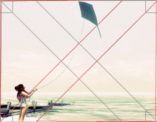 I like “I wish that you could see Fragments of you and me Cut and pasted from dreaming unfurled I swear I’m still your girl” by Paradox Ivory. I love how the chairs to the left and right are used to frame the picture, creating a frame within a frame. I am showing you the center lines of the picture so you can see that despite initial impressions, it is not exactly centered which gives its the picture more tension. Other elements that keep it from being to symmetrical are the shadows and even her pose that puts on shoulder higher than the other. The bright sand meets the sea at exactly a third of the way up, so the Rule of Thirds is called into play as well as the Rule of Odd Numbers, with the three chairs, even if two of them are clipped.