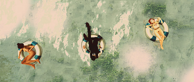 I like Suit up by Myf McMahon. I think this might be one of the happiest pictures I have ever seen. Of course, that might be because I love the water in first and Second Life. The sun on the water is so inviting and it forms a diagonal line that runs counter tot he slightly upward line of the floats. But look how the top of the one on the left kisses the horizontal center line while the float on the right touches it at the bottom. Corner to corner diagonal lines show they are placed in exact counterbalance. The center float is not right square on the exact center which is a good thing. That keeps it more dynamic, retaining the feel ing of movement. Dead center would be, well…dead.I also love the social commentary, the women are nude, the man fully clothes in a formal suit. It looks just like an ad for alcohol or a Bond film.