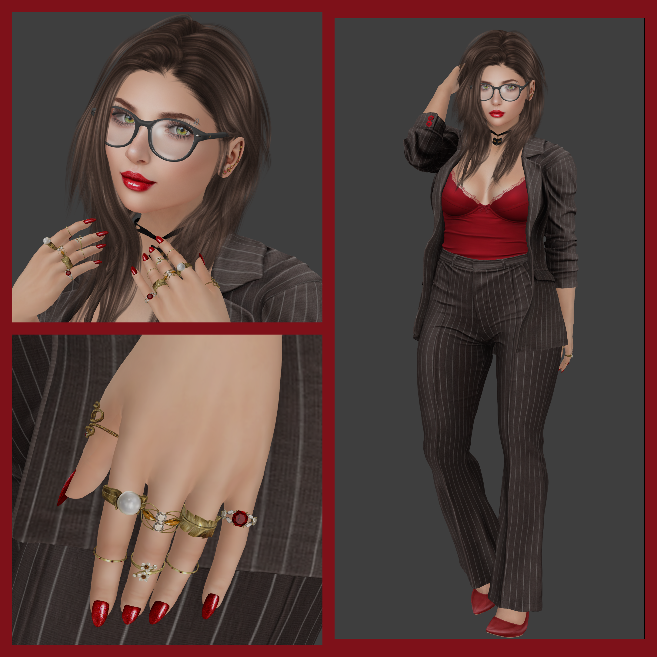 There are stores, around the grid, where you can’t just buy one item, you just have to fatpack the whole thing. Blueberry usually has a style that’s way too sexy for my taste, but whatever she releases, even the things I wouldn’t wear, are impeccably made. The mesh is flawless, the textures gorgeous. Her latest release, In Control, is no exception, and covers enough skin that I can feel comfortable wearing it. It comes with a choice of trousers or short skirt, a top that can be lacy-see through or plain (obviously I chose plain), a blazer jacket, and it even offers shoes but I opted for a pair of maxi heels from Reign. Look at me being all working girl!