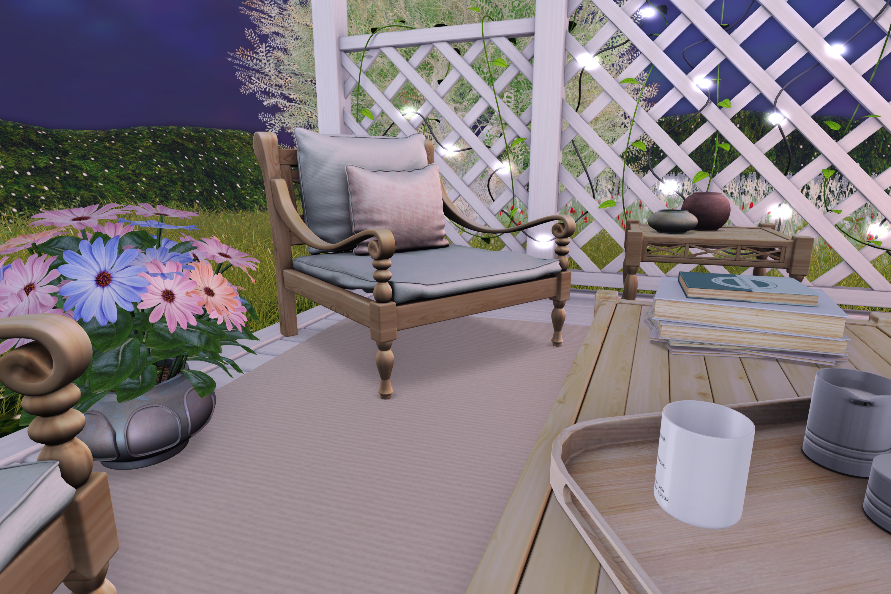 Oh hello! Have you seen the latest release from Cheeky Pea? It’s already available in the main store so no need to fight the lag at some overcrowded event. The lovely Carolyn Gazebo set features a gazebo (obviously), but also all the furniture you can see in the pictures : chair, sofa, coffee table, side table, chiminea (with flames!), coffee tray, rug and mugs, cute knick-knacks, and the loveliest potted daisies. I vote that Cheeky Pea start releasing more plants in the future, she’s really gifted with them!