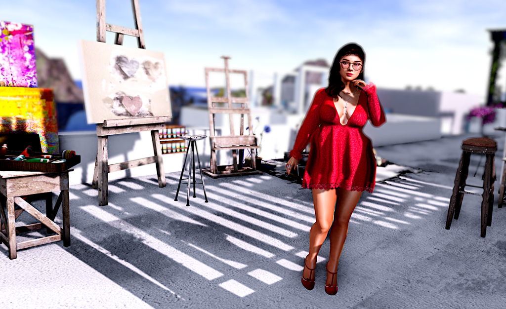 Since I was enjoying Little Santorini, I decided to stay a few extra days. I wandered along the narrow passages and found the artists corner. Isn’t it lovely? For the occasion, I was wearing the lovely new dress from Amias, found at the new Cosmopolitan Event, as well as the very cute glasses from Deep Static. Yummy rings, a Kunglers’ necklace and my old but still amazing shoes from The Secret Store perfectly compliment my outfit.