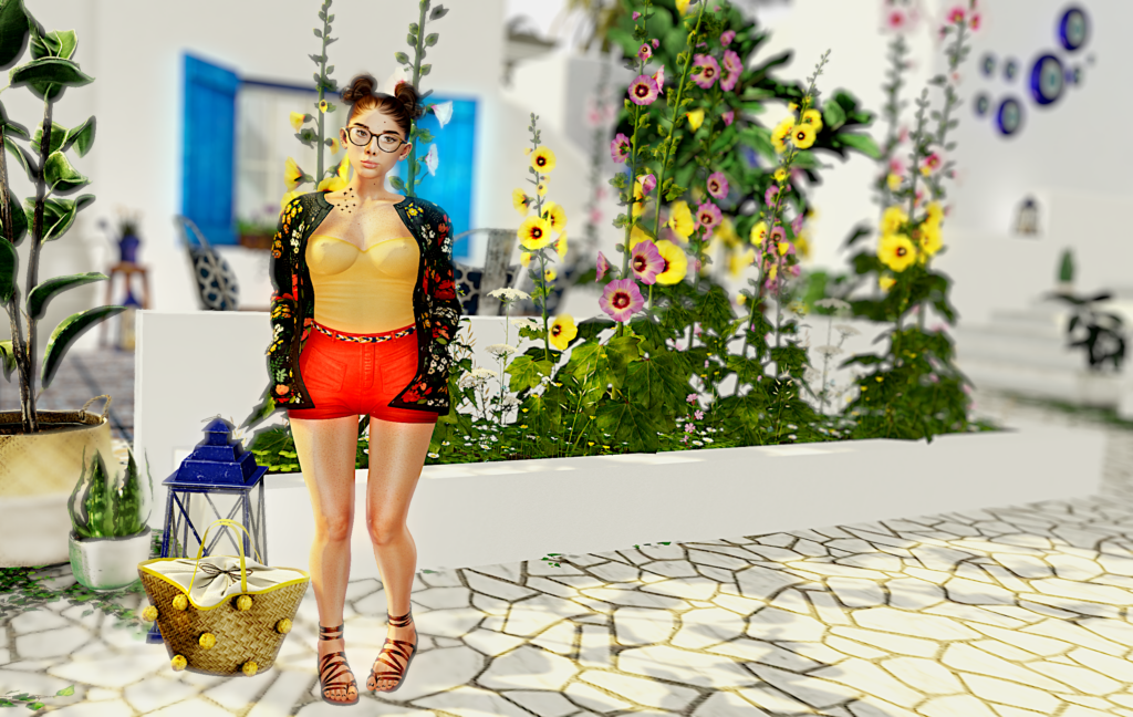 Rose is wearing : – Body : Maitreya – Lara – Head : LeLutka – Briannon – Skin : DeeTaleZ Skin Delaila for LELEVOX / BROWS: none/ Mixed – Eyebrows : Simple Bloom – EvoX AVALON LivSpring Neutral HUD_DIAMOND – Eyes : Banana Banshee – Orlah – Glasses : Sleepy Eddy – Boston Glasses (Wood) – Earrings : Little Fish – Miley – Ear tattoo : Heaux – Expensive Taste – Gold *EvoX – Moles : Izzie’s – Face Moles / Neck Moles – Eyebags : Izzie’s – LeL Evo X – 04 Eyebags – Hairbase : Tableau Vivant \ leLutka EvoX Hairbase 15 – 007 – Hair : Tableau Vivant \ Poire add-on – Tattoo : CAROL G – Stars Neck TaTToo Black Strong – Tank : Izzie’s – Basic Tank mustard – Shorts : The Secret Store – Cia Highwaist shorts – Cardigan : The Secret Store – Nava Cardigan – Floral – Bag : C’est la vie! – Huguette Bag – Shoes : friday – May Sandals (Earthen)
